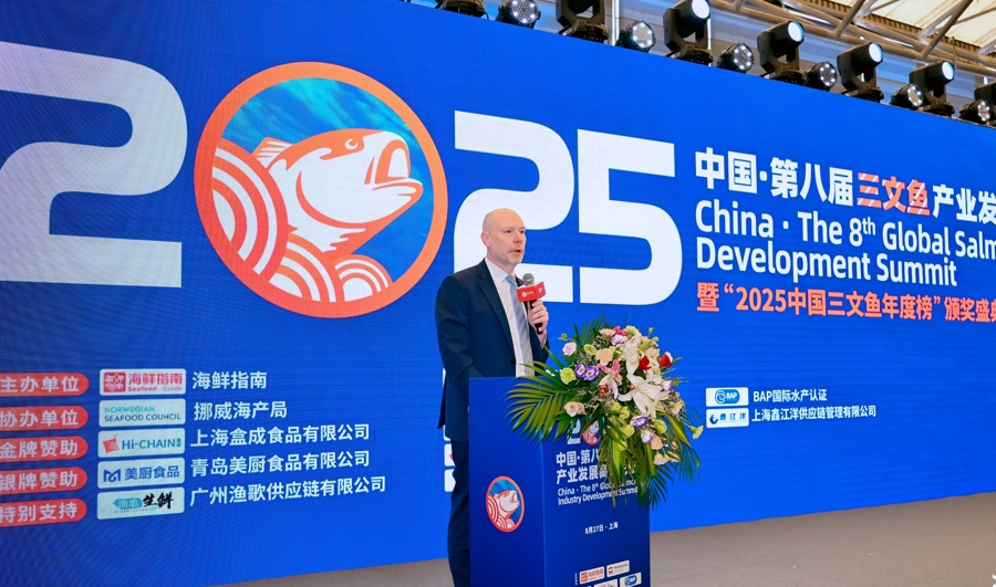 在展会首日举行的第八届三文鱼产业发展高峰论坛上大唐资本,挪威海产局中国区总监毕思明发表主题演讲,分享2025年全球及中国三文鱼市场的洞察与展望。作为挪威最具代表性的海产,挪威三文鱼在全球市场保持强劲增长。2025年大西洋三文鱼全球产量预计达到307.5万吨,同比增长9%,而挪威贡献了全球产量增长的62%。与此同时,2025年1月至7月,挪威对华出口三文鱼52,069吨,同比增长122%,出口额达46.73亿挪威克朗,同比增长64%。